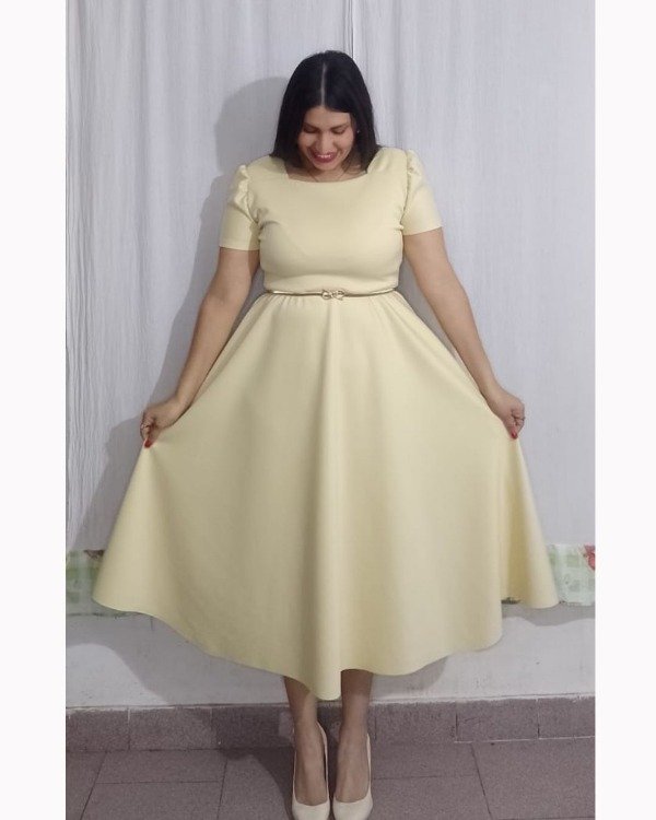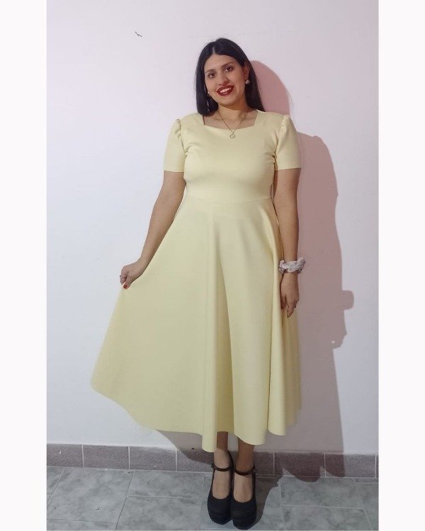 Este vestido,está confeccionado en tela scuba, que se adapta al cuerpo con suavidad y brinda un movimiento elegante,Su corte midi y falda con caída amplia logran un estilo femenino y atemporal, mientras que el color amarillo pastel aporta frescura y luminosidad.