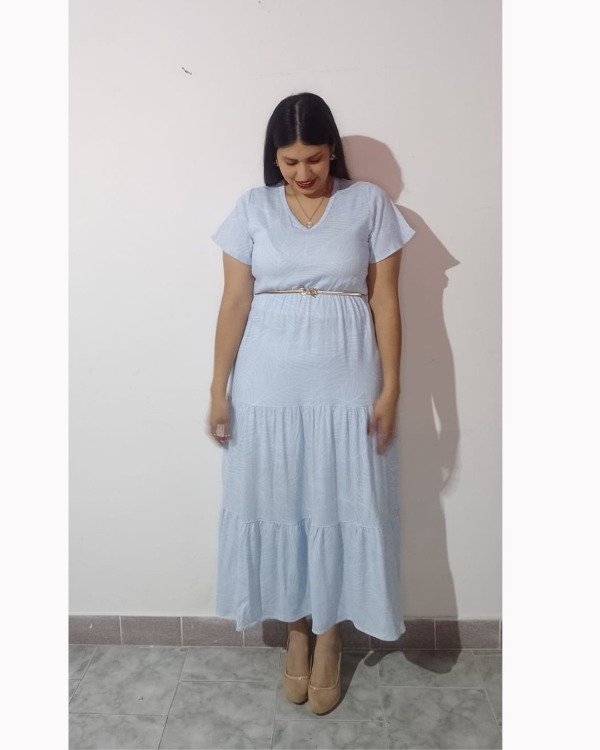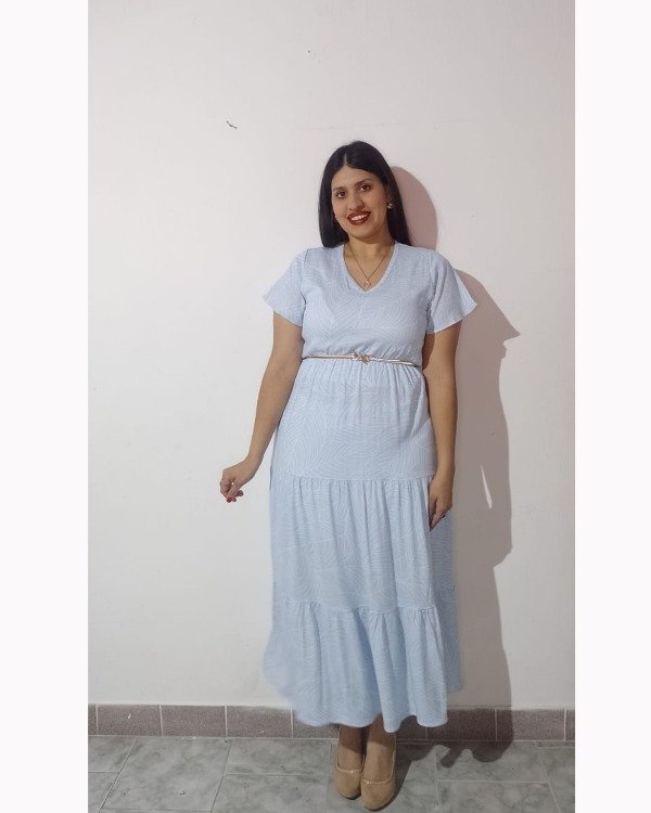 Vestido confeccionado en suave fibrana y spandex, esta estampada con sutiles hojas en tono celeste. Su diseño de corte largo y amplio con falda de volados le da movimiento, el escote en V y las mangas cortas aportan feminidad, mientras que el cinturón delgado ajustable realza la cintura y estiliza la silueta.