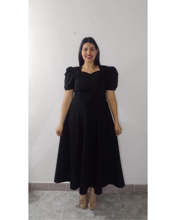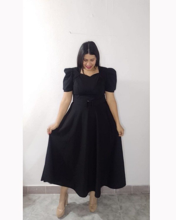 Vestido negro confeccionada con tela scuba, super elegante con mangas abullonadas, y falda midi que le da un aire muy clasico, contiene un cinto en la parte de adelante de decoracion.