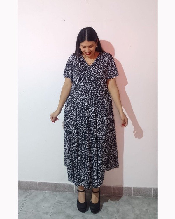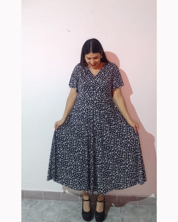 Encanto melodía,está confeccionado en tela seda suave, ligera y de gran frescura, ideal para los días cálidos. Su diseño midi con falda amplia otorga comodidad y movimiento.Tiene un estampado floral en blanco sobre fondo negro con pequeñas flores en todo el vestido.