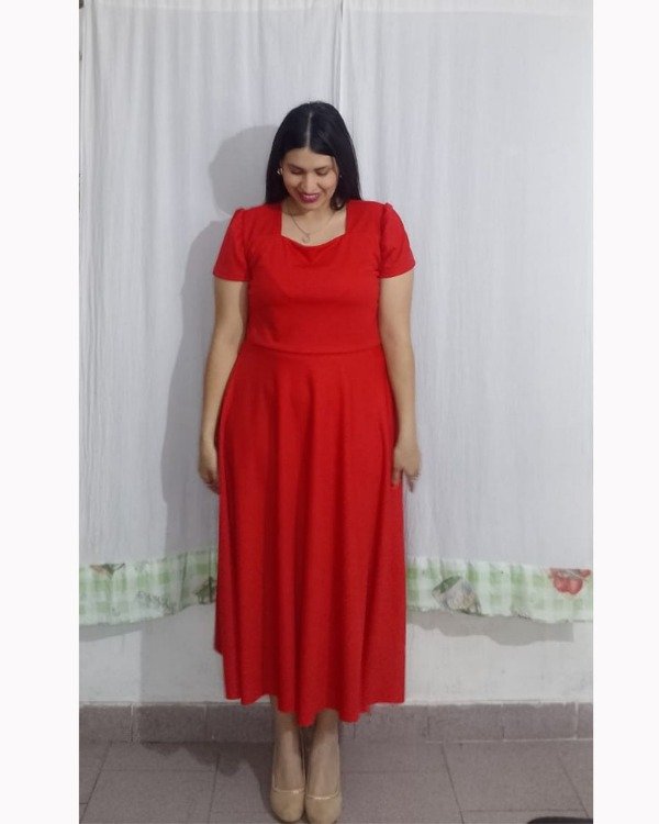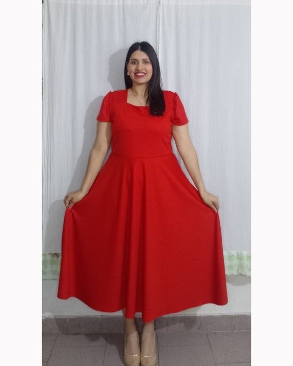 Vestido de tela scuba brillosa color rojo, con escote cuadrado, mangas cortas ligeramente abullonadas y una falda de vuelo amplio que realza la figura.