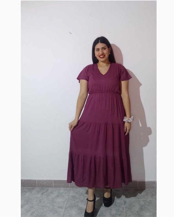 Vestido color vino con un escote en V, las mangas cortas y la cintura elástica crean una silueta favorecedora sin sacrificar libertad de movimiento, opción ideal para tardes relajadas, salidas informales o encuentros con un toque romántico.